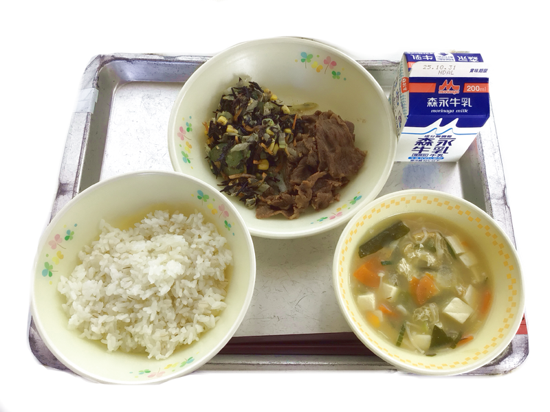 今日の給食【10月20日(月)】:麦ごはん 牛乳 牛肉の炒め物 ひじきサラダ 豆腐のみそ汁