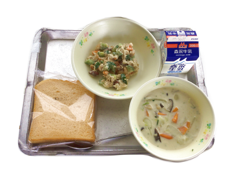 今日の給食:熊本県産トマトパン 牛乳 秋野菜のシチュー ビーンズサラダ