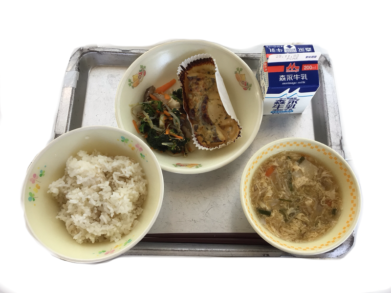 今日の給食:麦ごはん 牛乳 ホキのみそマヨ焼き おひたし かきたま汁