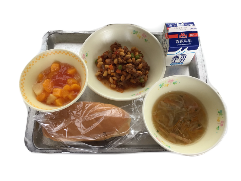 今日の給食:コッペパン 牛乳 チリコンカン ジュリアンスープ フルーツジュレ