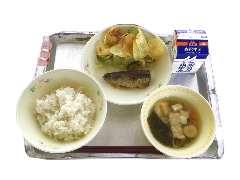 今日の給食【10月27日(月)】:麦ごはん 牛乳 いわしのおかか煮 ポテトチップスサラダ ふ汁