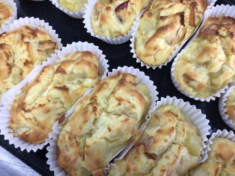朝からりんごを洗い、約100個のりんごを切る作業から始めました。たくさんのりんご、ヨーグルトが入った生地を一つずつカップに入れる作業など大忙しの給食室でした。