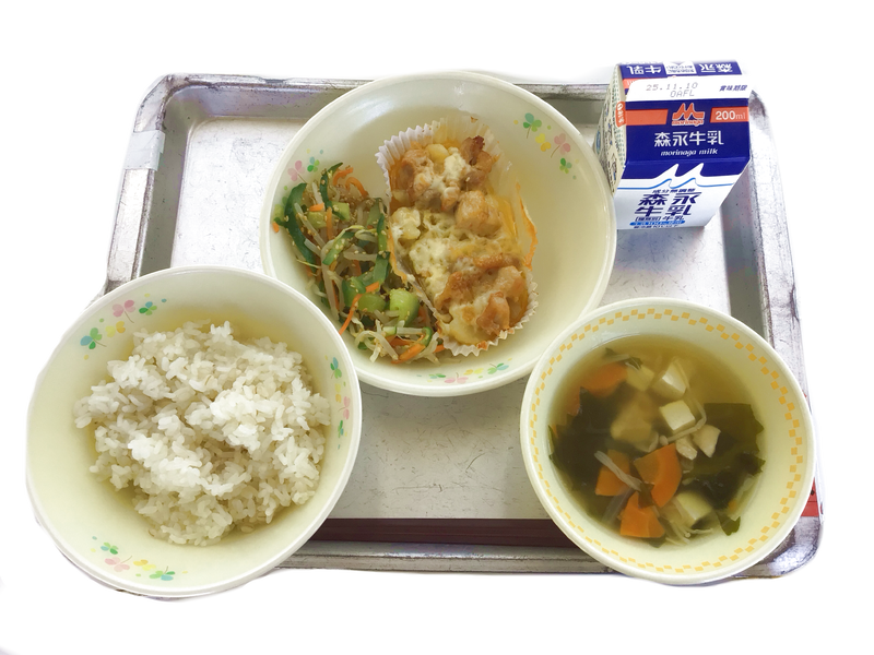 今日の給食【10月30日(木)】:麦ごはん 牛乳 チーズダッカルビ もやしのナムル わかめスープ