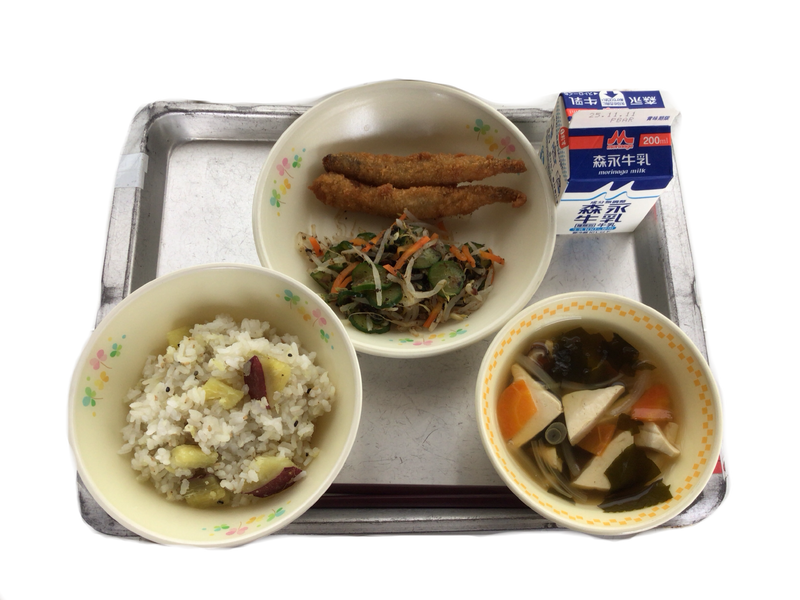 今日の給食:からいも飯 牛乳 ししゃもフライ 梅かつお和え 豆腐汁