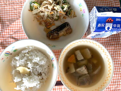 献立:栗ご飯、牛乳、つぼん汁、さんまの甘露煮、おかか和え