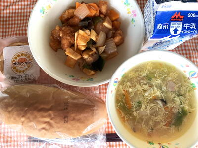献立:コッペパン、牛乳、酢鶏、卵とレタスのスープ、焼きプリンタルト