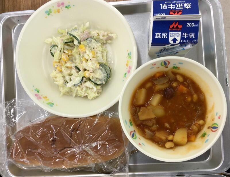 献立:ミルクパン 牛乳 チキンビーンズ ツナマヨサラダ