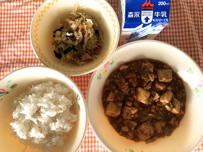 献立:麦ご飯、牛乳、マーボー豆腐、バンバンジーサラダ