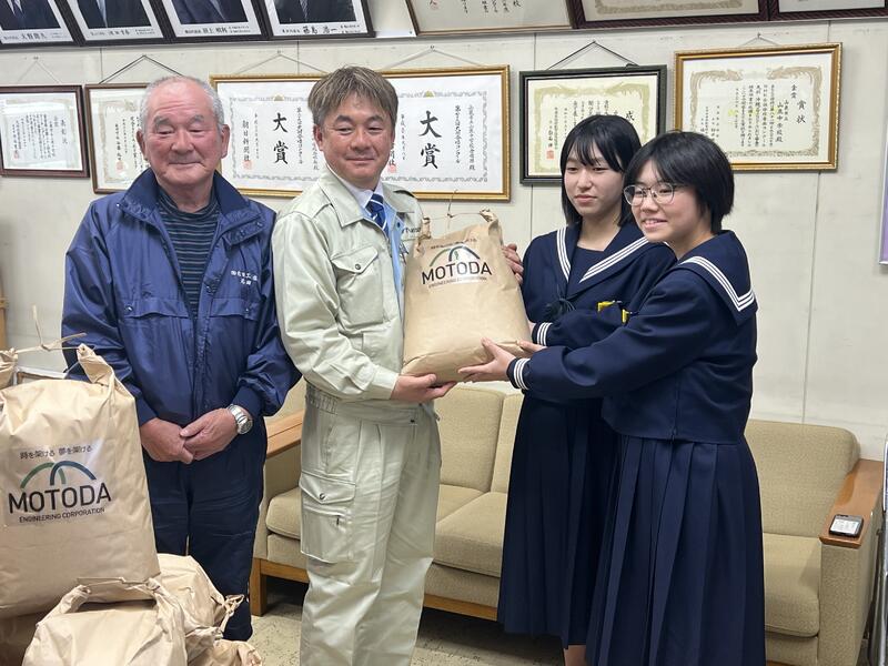 先日、新米をご寄付いただいた「(有)元田工務店」様をお迎えし、11月21日(金)に新米寄付贈呈式を行いました。元田工務店から3名、山鹿市教育委員会から2名の皆様にご参加いただき、温かいご支援に対して、心より感謝する寄贈式になりました。