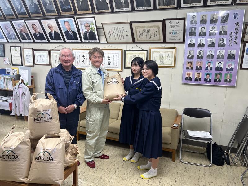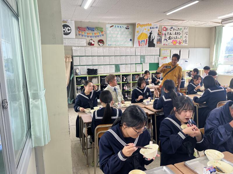 代表生徒の嶋田さんは「新米の香りがして、とてもおいしいです。」永田さんは「もっちりしていて、食べやすいです。」と感想を添えて感謝の言葉を発表しました。その後は、教室で一緒に給食を囲み、和やかな交流の時間となりました。