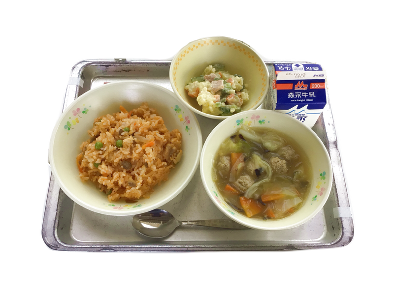 今日の給食:チキンライス 牛乳 肉団子と春雨のスープ マセドアンサラダ