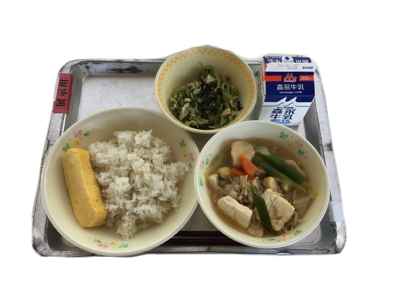 今日の給食:麦ごはん 牛乳 寄せ鍋 厚焼き卵 ほうれん草のサラダ