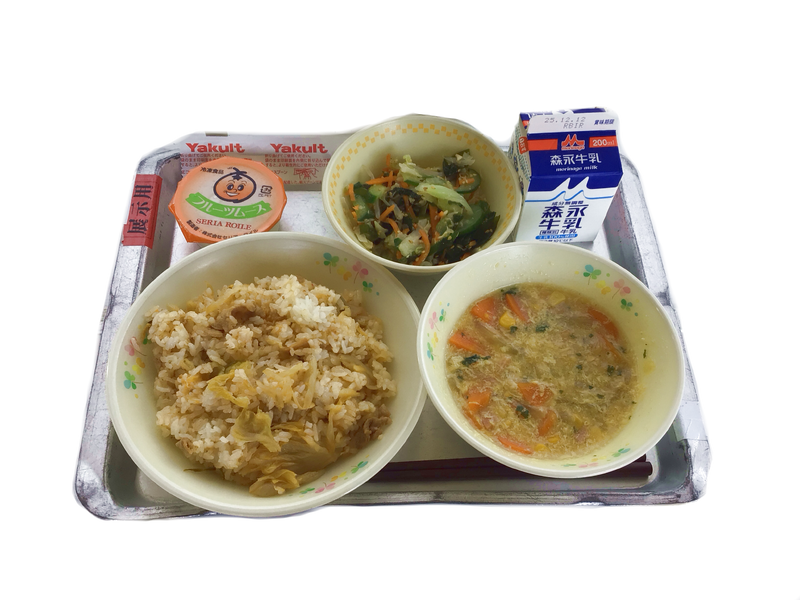 長野県塩尻市の学校給食で考案され、ユニークな名前と美味しさから全国的に広がったそうです。キムチが辛いという生徒もいましたが、美味しそうに食べていました。