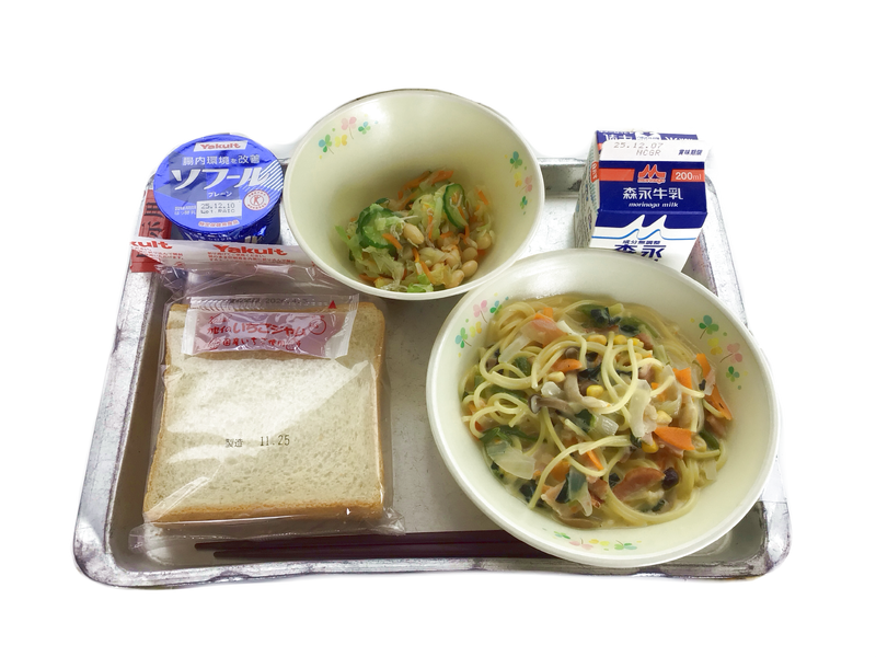今日の給食:食パン 牛乳 クリームスパゲッティ じゃこまめサラダ ヨーグルト いちごジャム