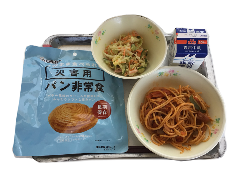 今日の給食:非常食用パン 牛乳 ナポリタン コールスローサラダ