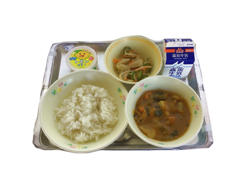 今日の給食【12月19日(金)】:冬野菜のカレー 牛乳 こんにゃくサラダ レモンゼリー