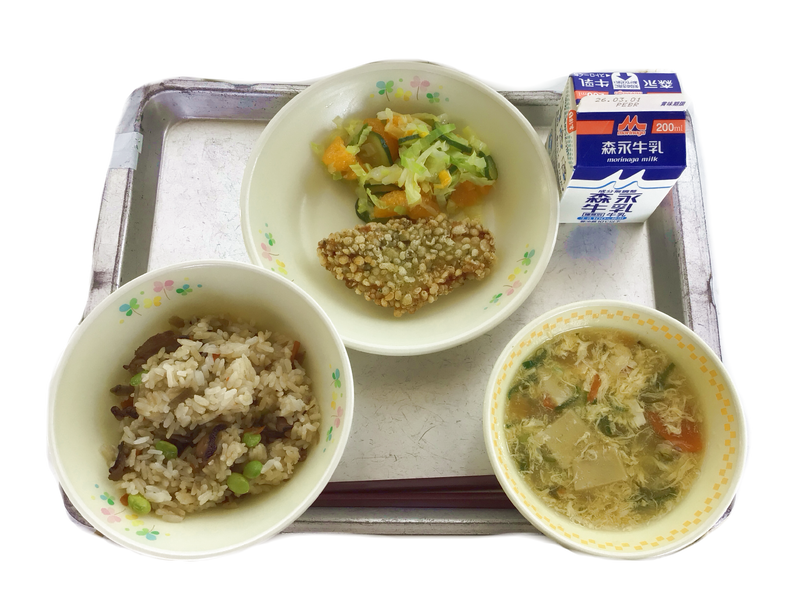 ふるさとくまさんデー(天草) 投稿日時 : 02/19 栄養教諭 今日の給食:たこめし 牛乳 真鯛の天玉揚げ みかんサラダ めかたま汁 毎月19日は食育の日です。今日はふるさとくまさんデーとして天草の味を紹介しました。 真鯛の天玉揚げは、天草でとれた鯛でした。