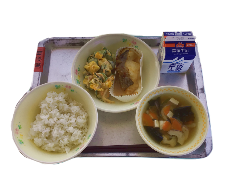 今日の給食:麦ごはん 牛乳 魚のゆずみそかけ かぼちゃサラダ 豆腐のすまし汁