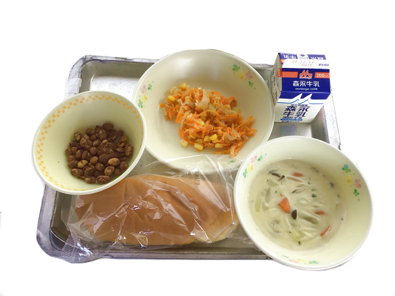 今日の給食:ミルクパン 牛乳 クリームシチュー にんじんサラダ ココアビーンズ