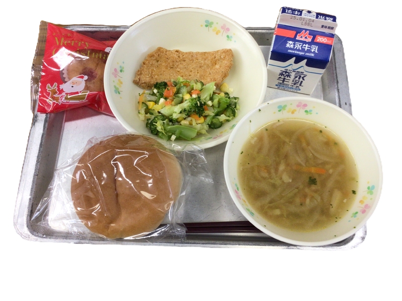 今日の献立:丸パン、ジュリアンスープ、もみのきサラダ、クリスピーチキン、カップケーキ、牛乳