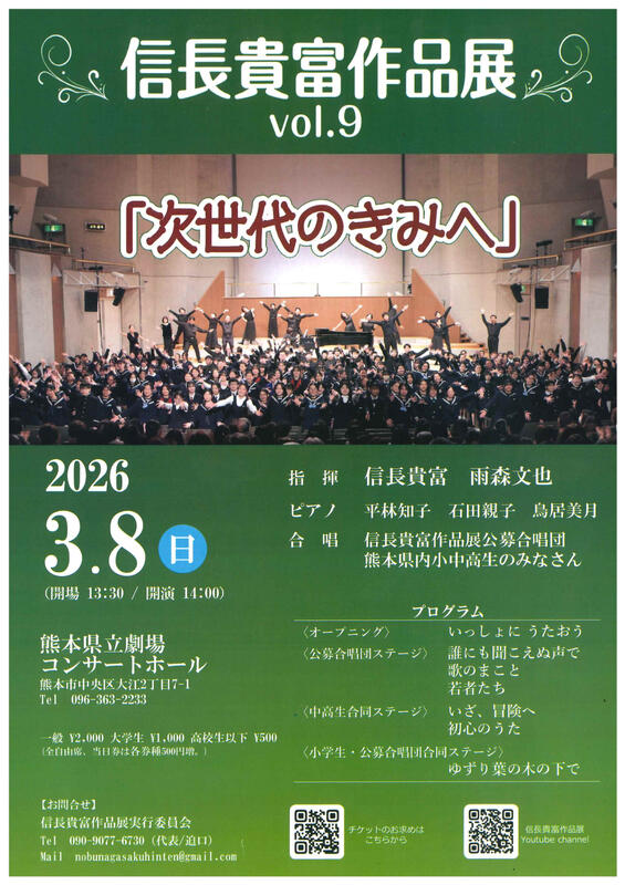 「信長貴富作品展Vol.9」に今年も出演させていただくことになり、全国各地の関係者・団体と一緒に計5曲披露します。