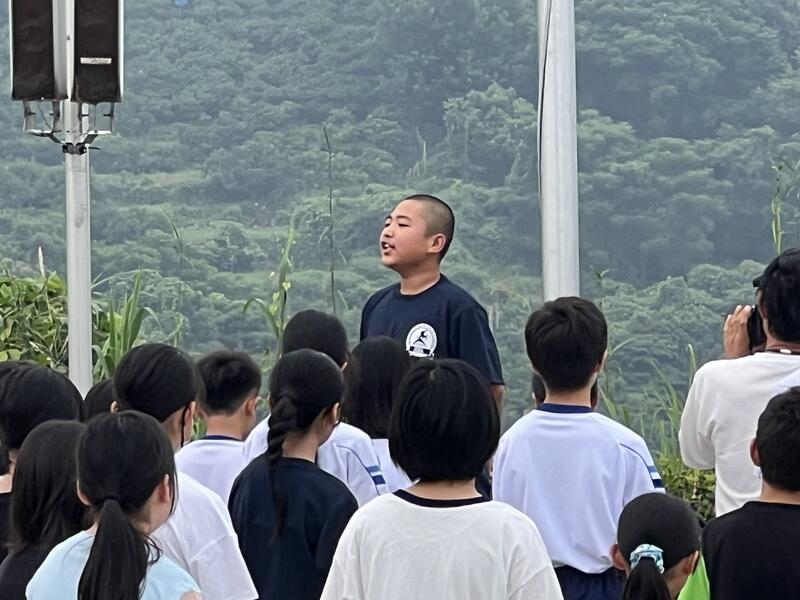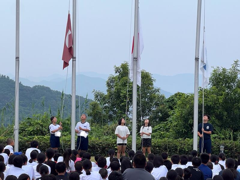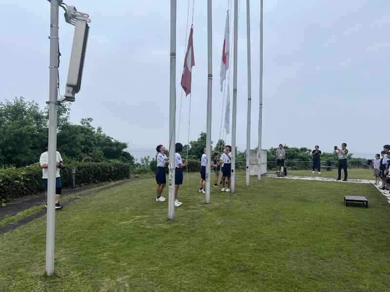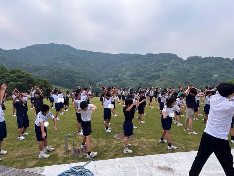 7月2日、天気は晴れです。集団宿泊教室2日目の朝を迎えました。朝は6時30分の起床です。錦町立木上小学校と一緒に朝の集いを行いました。旗の掲揚やラジオ体操を通して、体を起こし、1日の確認ができました。よ〜し今日もがんばるぞー!