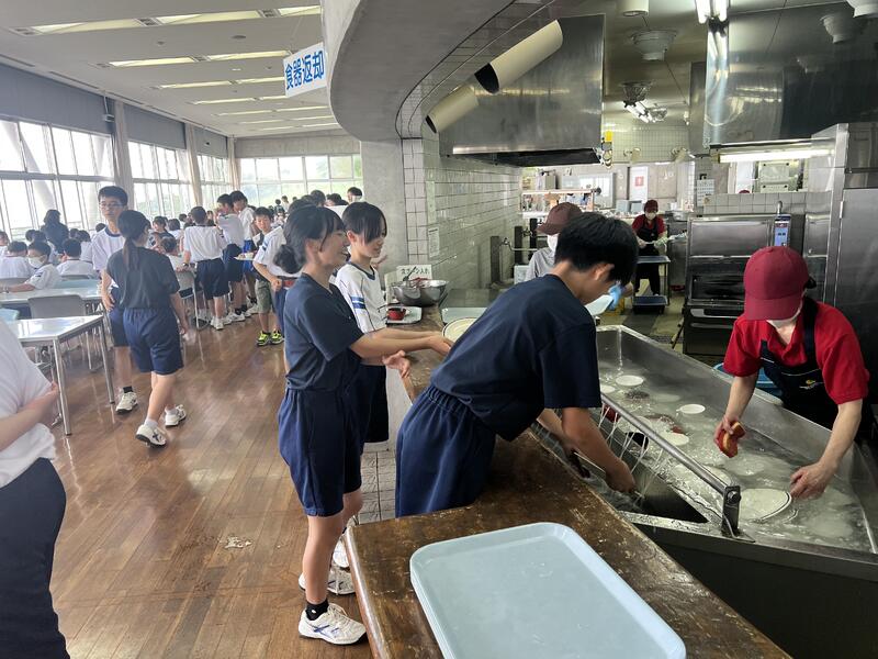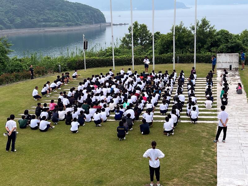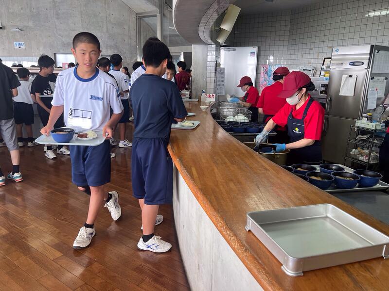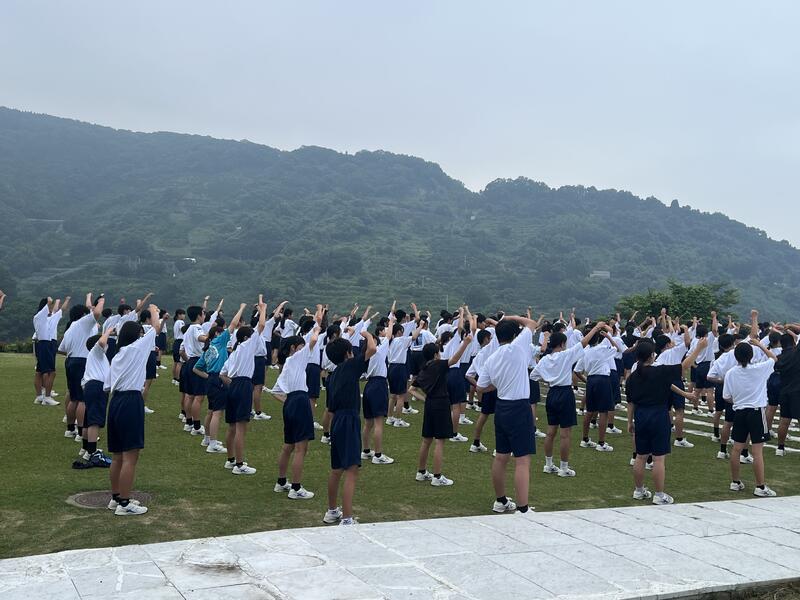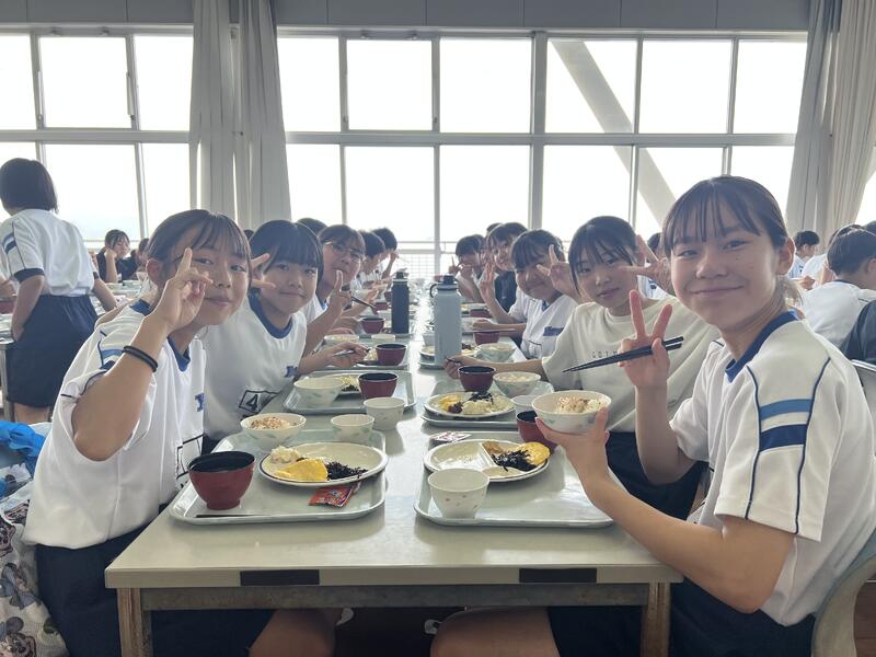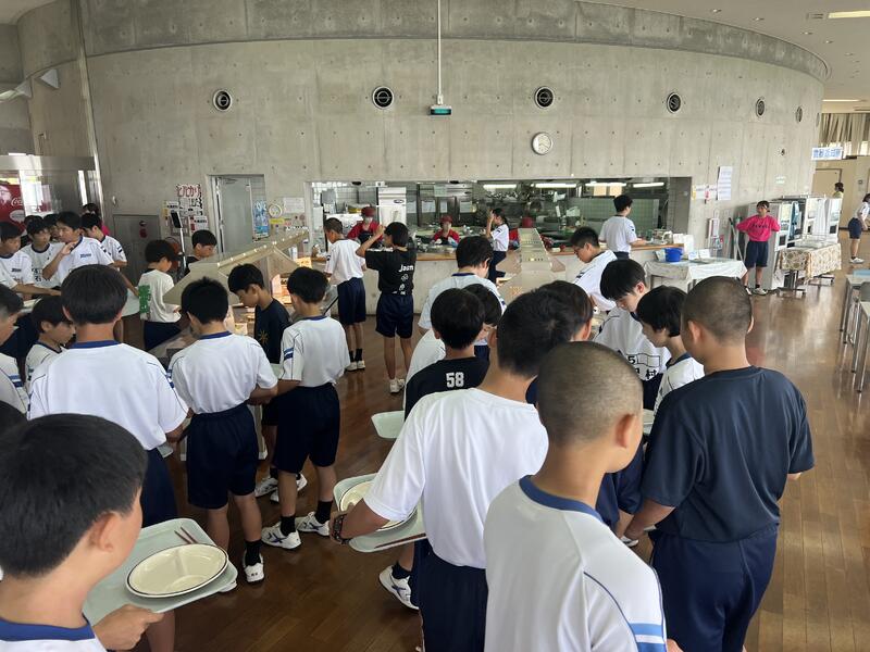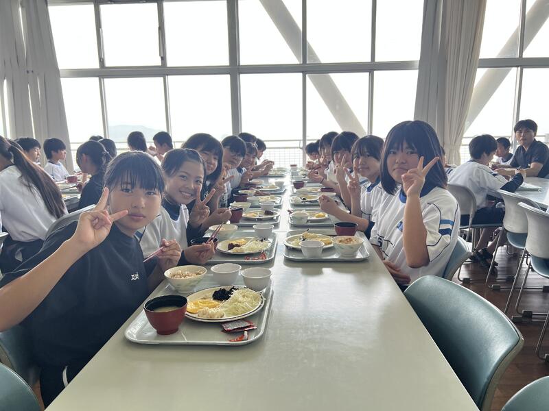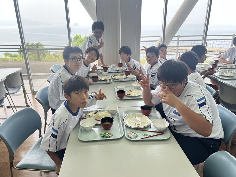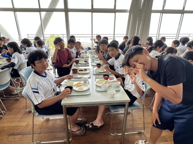 7月3日、集団宿泊教室最終日の朝を迎えました。天気は晴れ、今日も朝から気温が上がっています。生徒の皆さんは、6時30分に起床し、錦町立木上小学校と一緒に朝の集いを行いました。みんな元気です。1組から3組が朝食をとり、4組から6組は退所の準備として、身支度と部屋の整理整頓を行いました。