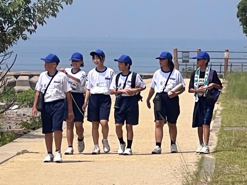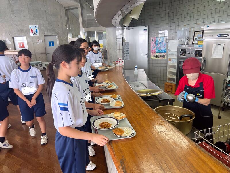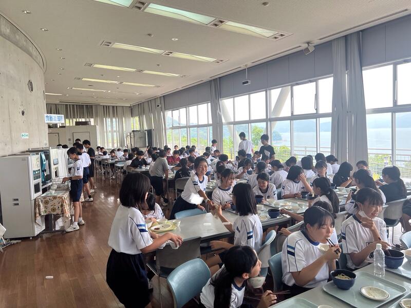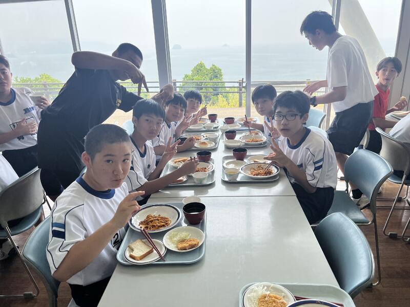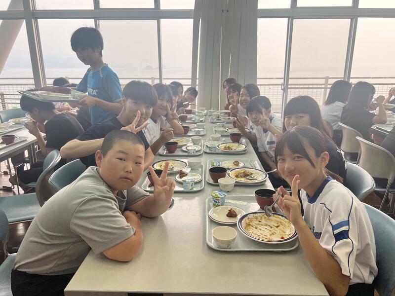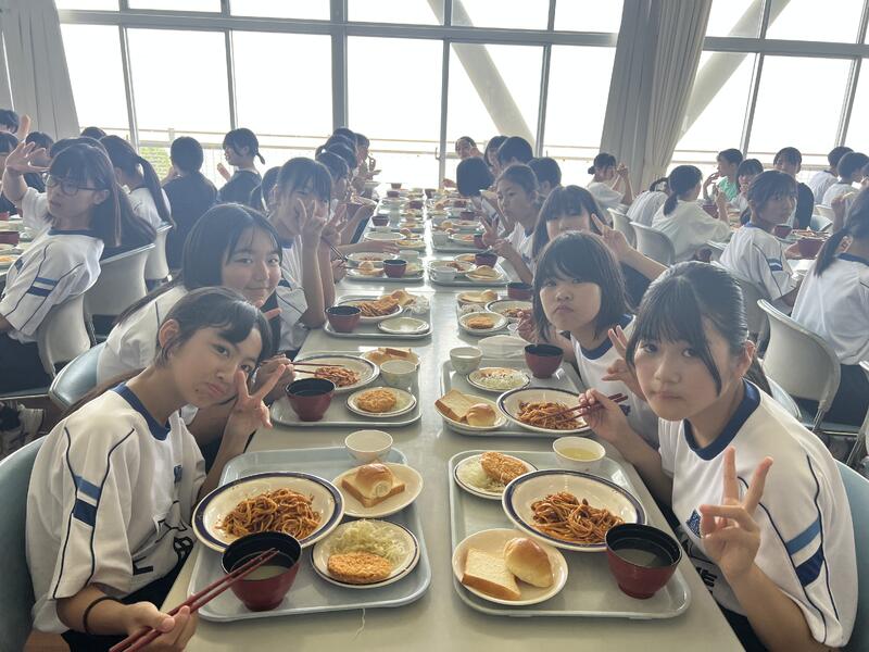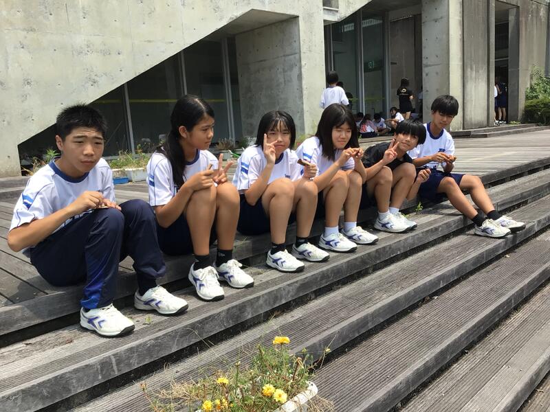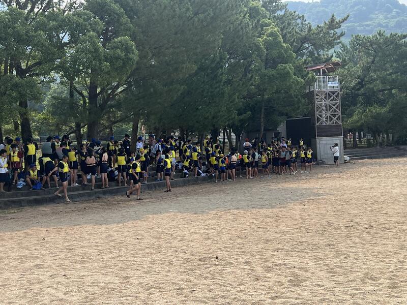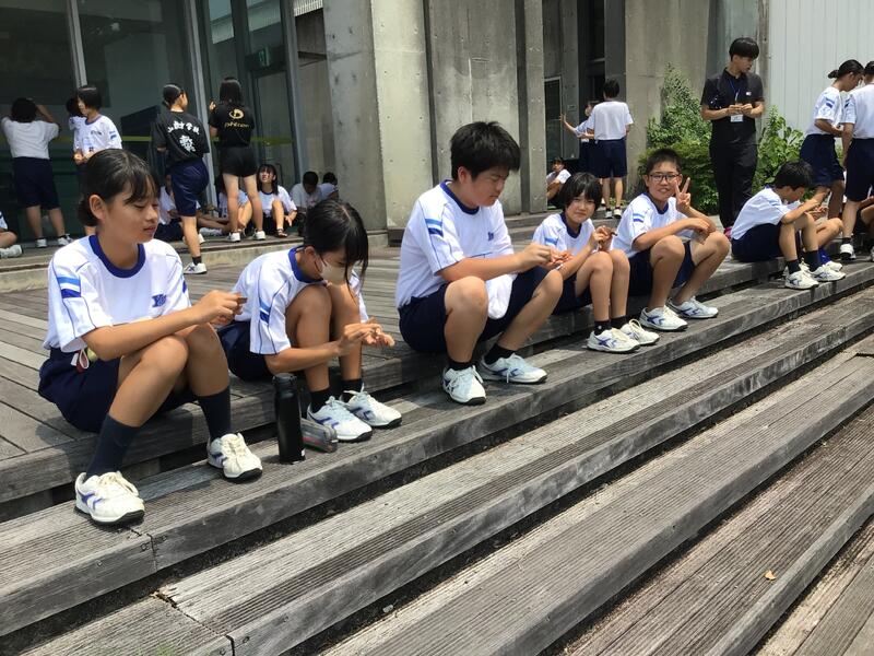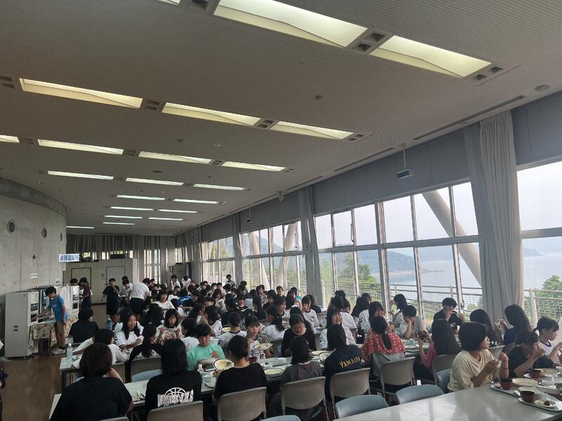 12時から3クラスずつ交代で昼食です。スパゲッティをおかわりして残さず食べていました。昼からは午前中のマリン活動とフォトウォークラリーを反対に分けて活動します。暑さに負けず、励まし合いながら元気に頑張っています。