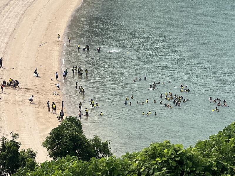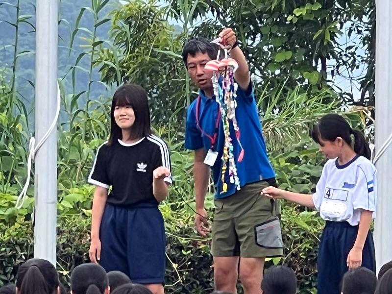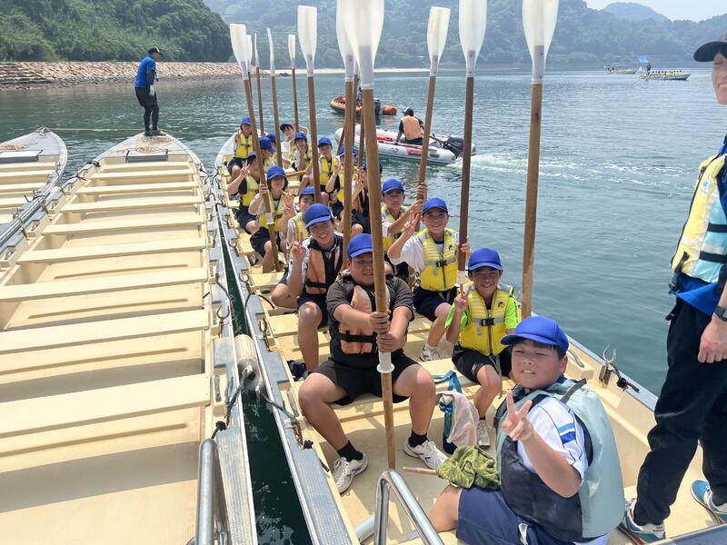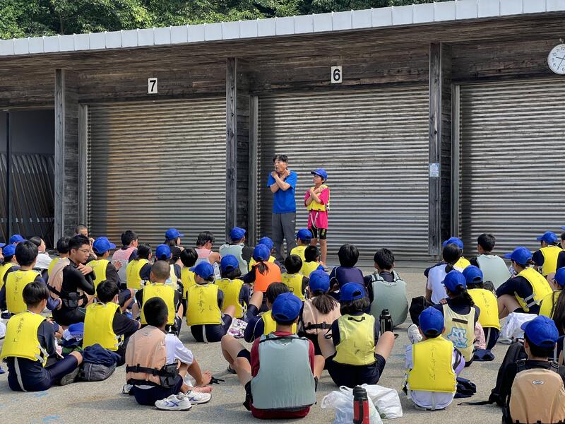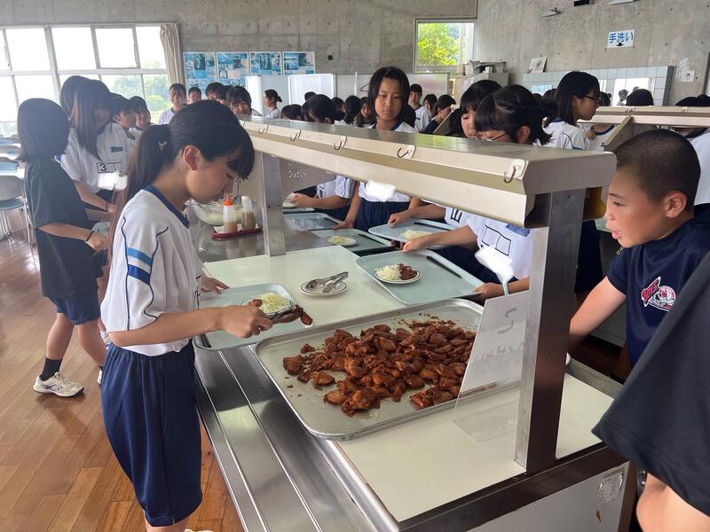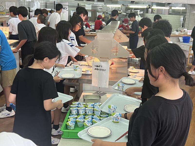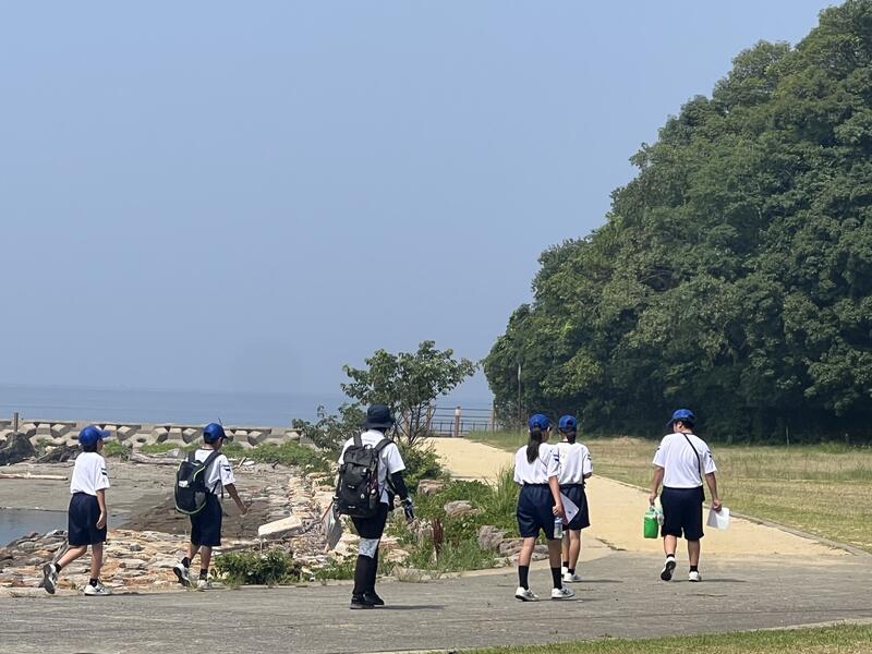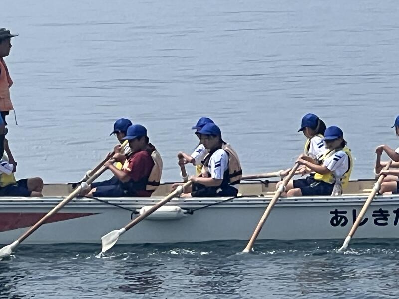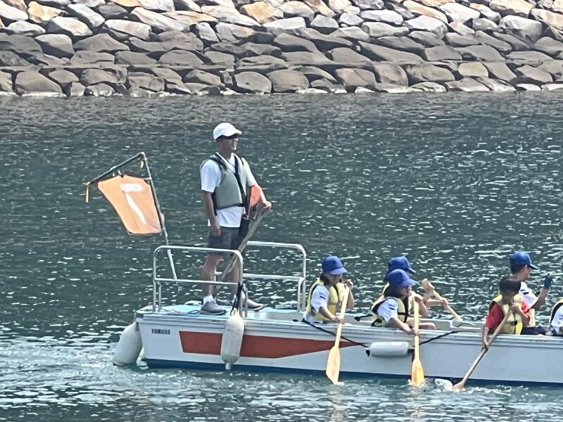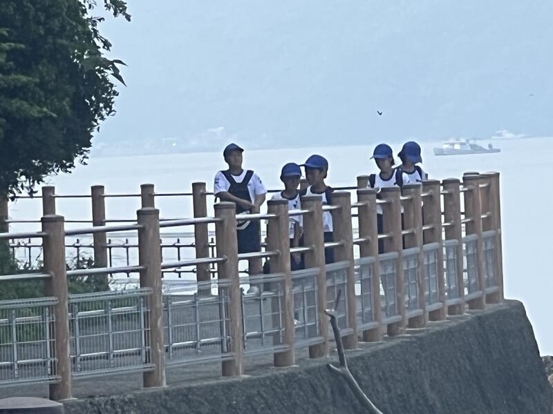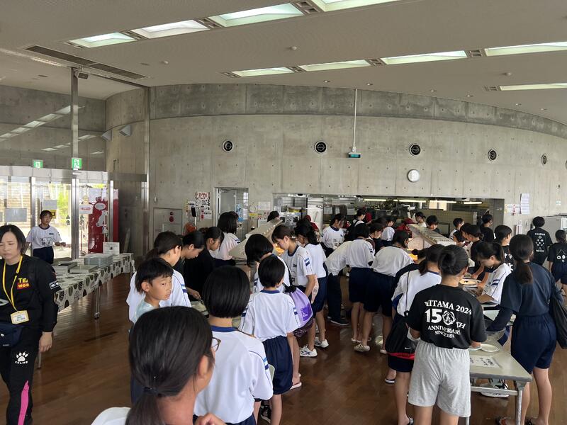 12時から3クラスずつ交代で昼食です。スパゲッティをおかわりして残さず食べていました。昼からは午前中のマリン活動とフォトウォークラリーを反対に分けて活動します。暑さに負けず、励まし合いながら元気に頑張っています。