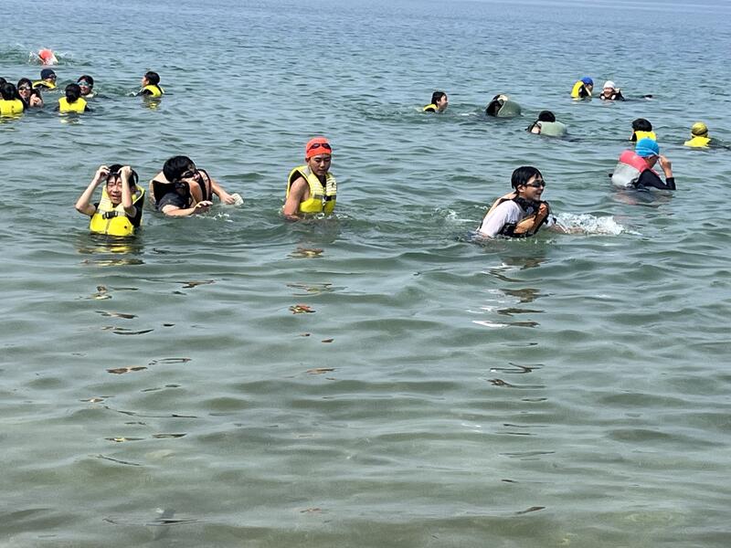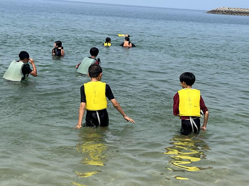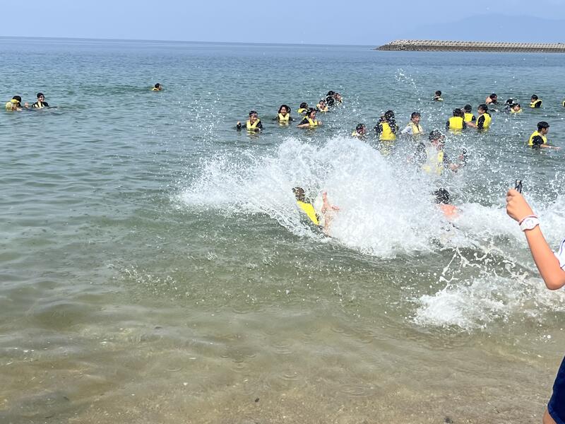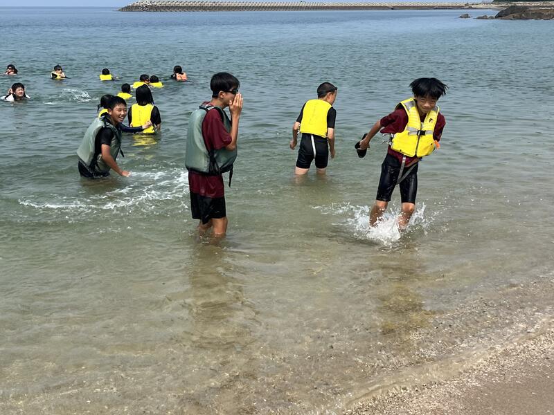 9時30分から「流木ストラップづくり」と「海水浴、流木貝殻拾い」に分かれて最後の活動をしました。海水浴では所員の方から離岸流で流された時の対応の仕方等の説明を聞いて海に入りました。いろんなところから歓声が上がっていました。