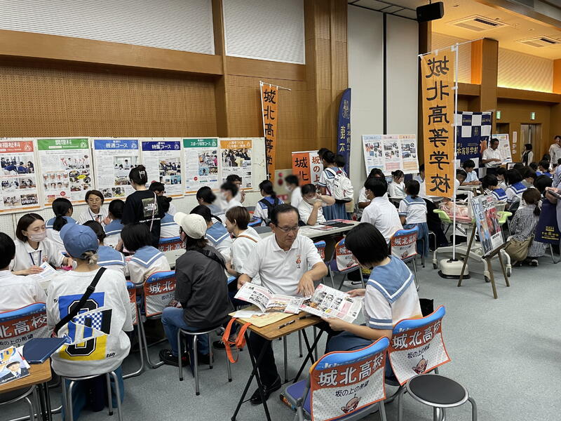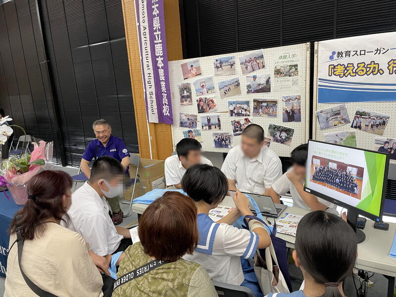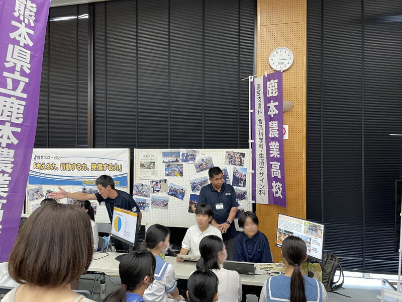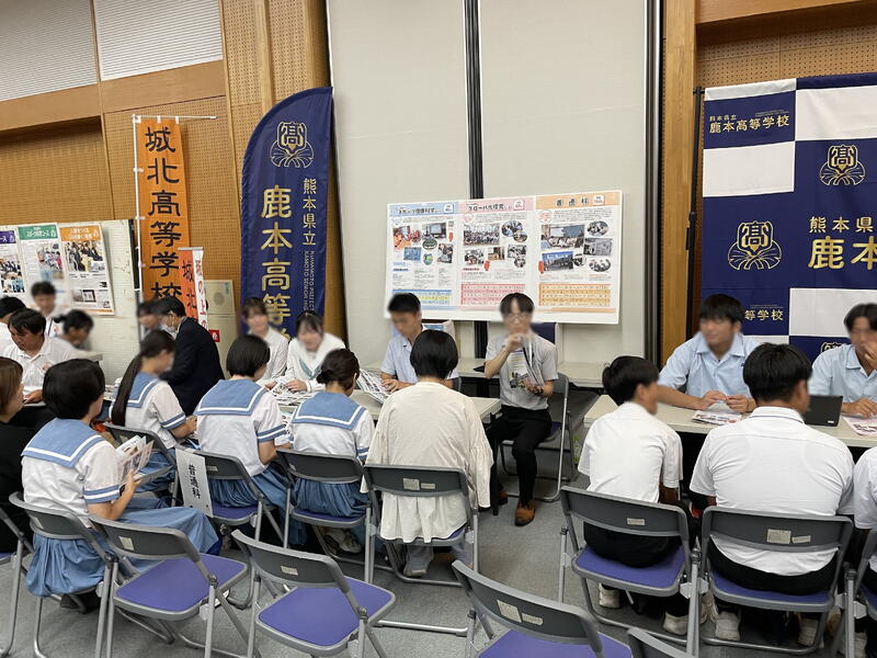 7月6日(日)、山鹿地区高等学校等(鹿本商工・鹿本・鹿本農業・かもと稲田支援学校・城北)の合同進学説明会が、山鹿市鹿本市民センター「ひだまり」で開催されました。会場には、高校ごとにブースが設置してあり、先生や生徒の皆さんが学科やコースについて丁寧な説明をしてくださいました。参加した本校生徒や保護者の皆さんも各学校の特色等の理解が進んだと思います。