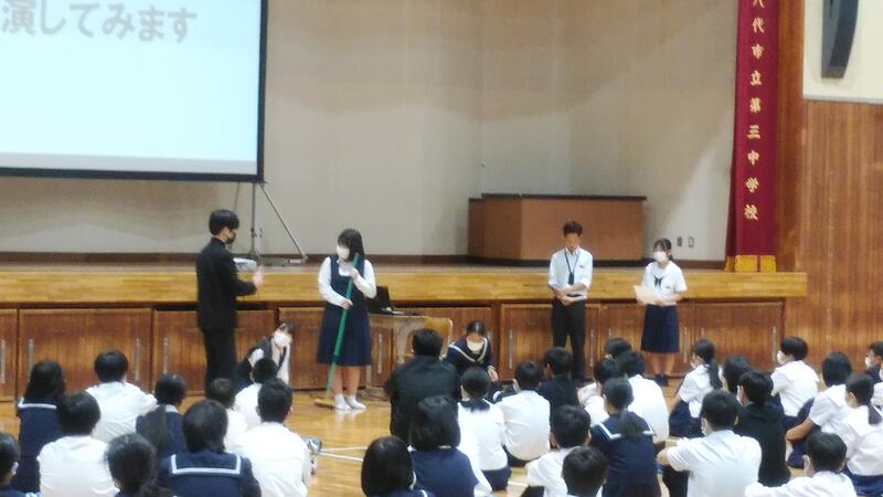 環境委員会は、寸劇を通して無言掃除の仕方について発表しました。