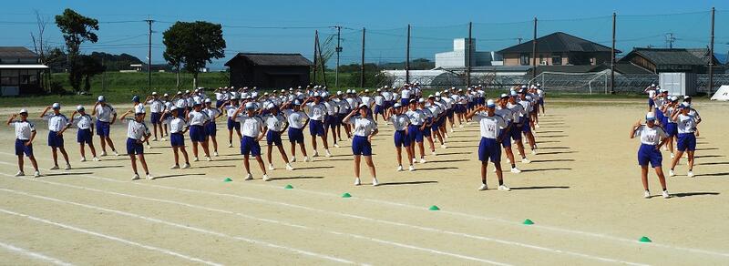 開会式は体育館で行われました。校長先生のお話の後、選手宣誓、準備体操と続きます。