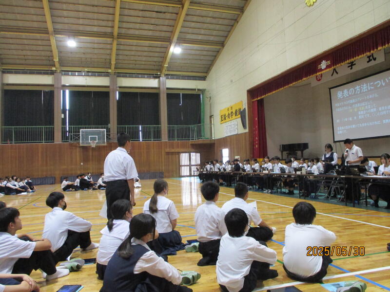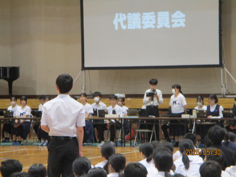 0530 生徒総会 投稿日時 : 06/02 学校サイト管理者 5月の一大行事,生徒総会です。 生徒会や各委員会長,副委員長を中心に 委員会活動の年間計画や,学校をよりよくするための取組を提案し 決議をとりました。