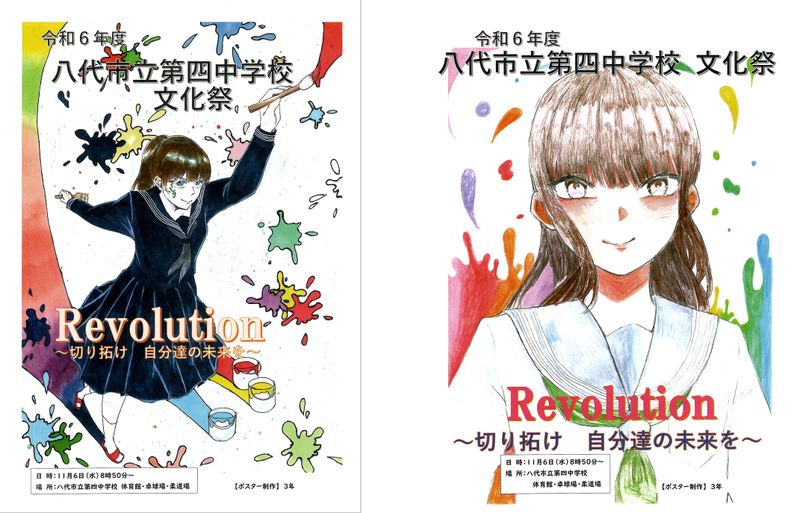11月6日(水)開催予定の文化祭(合唱コンクール)ポスターを美術部3年生の2人が作成しました。今年度の文化祭テーマは「Revolution~切り拓け 自分達の未来を~」です。