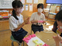 本校2年生は、10月9日(木)に八代支援学校を訪問し、交流会を行いました。支援学校の秋祭りで使用する飾り付けを、一緒に協力して作成しました。