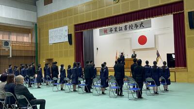 卒業式当日は、「選抜合行唱隊」の美しいハーモニーで幕を開け、卒業生一人一人に卒業証書を授与いたしました。続いて「校長式辞」の後、「八代市教育委員会告示」、「来賓祝辞」を頂戴し、卒業生へ新たな門出を祝う温かなメッセージが届けられました。