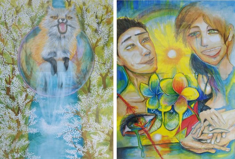最近、スポーツでの活躍を紹介するニュースが多くありましたが、今回は美術部の活躍を紹介します。西日本読書感想画コンクールの熊本県審査で、1年生の谷坂陽菜さんが「指定図書の部」で、2年生の篠原涼那さんが「自由図書の部」で特選に選ばれ、西日本最終審査に出品されることになりました。おめでとうございます。左側の作品が篠原さんの作品「美しい未来へ」で、右側の作品が谷坂さんの作品「虹色のオハナ」です。最終審査でも、高い評価が得られるものと期待しています。
