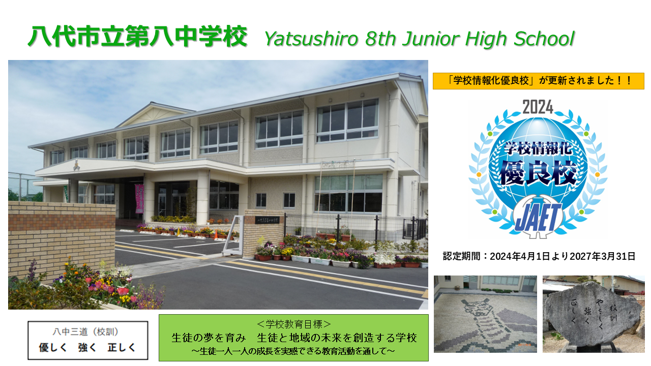 生徒会で考案した 八中マスコットキャラクターを紹介します 【 ハチみっつー 】です。 各委員会で作成する掲示物等に掲載されています。 学校を訪れた時は、ぜひ探してみてください (生徒会執行部) |
