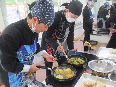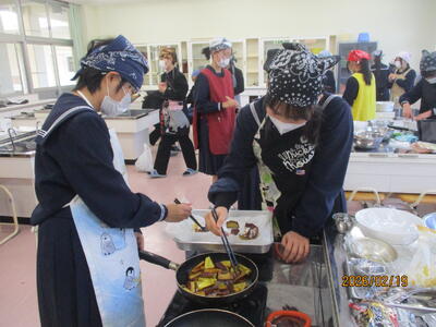 12月19日(金)、総合的な学習の時間を利用して、3年生で郷土料理教室を実施しました。宮地更生保護女性会の皆様の協力を得て、地元の食材を使って調理することで、食への感謝と郷土宮地を大切にし、地域の方による郷土料理伝承の機会とすることを目的に毎年行っているものです。