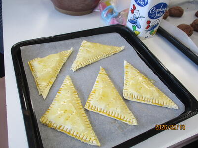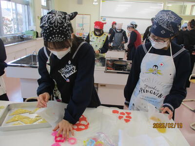 2月19日(木)、3年生の家庭科の授業で調理実習を行いました。今回は、「幼児に与えるおやつ」というテーマで、それぞれの生徒が幼児向けのおやつを決め、そのレシピや作り方を調べて調理に挑戦しました。調理は班ごとに行いましたが、作るものは個人でそれぞれ違うため、材料や調味料等も様々で、生徒たちは悪戦苦闘?しながらも協力しておやつ作りを頑張りました。生徒たちが作ったおやつを一部紹介します。