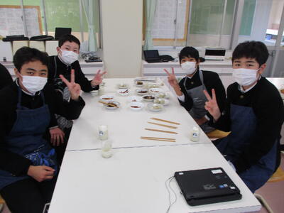 今年も技術の栽培の時間等を利用して校内の畑で1学期から大切に育て、先月収穫していたさつまいもと一緒にだご汁を作りました。だご汁の他にも地元でとれた大根、白菜、人参などを材料にサラダやデザートも作りました。女性会の皆様も各班に入っていただき、食材の切り方や団子のこね方など生徒たちと会話を楽しみながら教えていただきました。最後は、3年部の先生方も一緒にできあがった料理をみんなでおいしくいただきました。