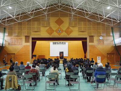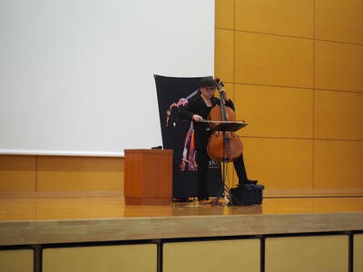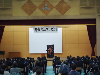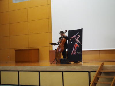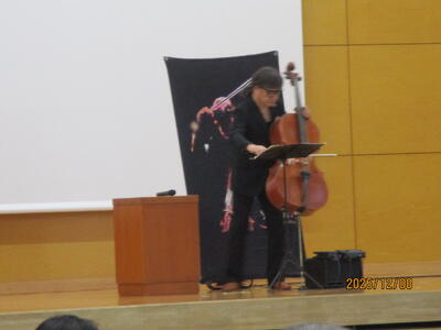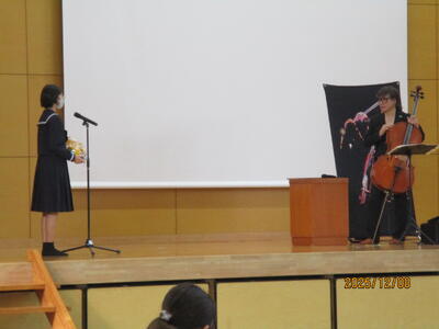12月8日(月)、本校体育館において「音楽 心のプレゼント」を開催しました。これは、宮地更生保護女性会による活動の一環で、毎年本校で開催され今回で26回目を迎えました。毎年、音楽活動をされている様々なジャンルの方をお招きし、本校生徒、教職員のみならず保護者や地域住民の皆様にも、演奏等を聴いていただいています。今回は、チェロ演奏者の吉川(きっかわ)よしひろさんをお招きし、チェロの奏でる優しく時には力強い演奏をお聴きしました。多くの曲目を披露されましたが、本校の校歌もアレンジされ演奏していただきました。