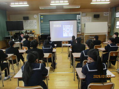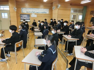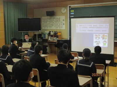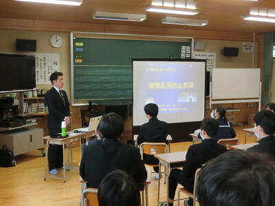 1月27日(火)、3年生を対象に薬物乱用防止教室を実施しました。薬物乱用行為の有害性や違法性等について、正しく理解し行動できる態度を身に付けることを目的に例年実施しています。今年は、八代警察署生活安全課少年係長の矢津田 竜太様を講師にお招きしご講話をいただきました。講話の中では、違法薬物の種類やその有害性、少年による違法薬物使用による逮捕者の増加、違法薬物使用の誘いの手口などの話がありました。自分自身や家族、自分の身近な人たちを守るためにも、誘いをきっぱりと断る勇気を持つことの大切さを話していただきました。
