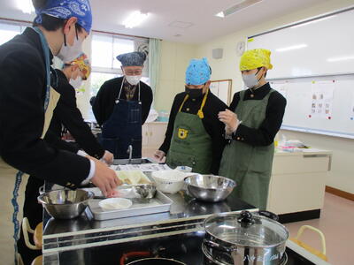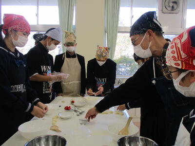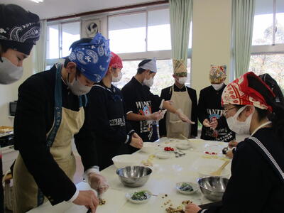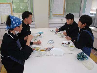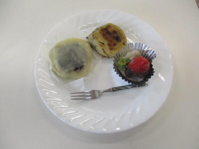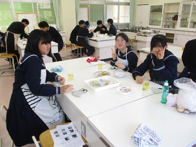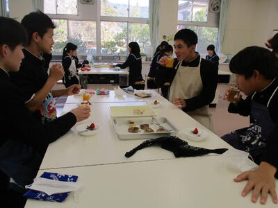 いきなり団子は、3年生が技術の栽培の授業で収穫したさつまいもを使わせてもらいました。いちご大福は、いちごを白玉の皮で全部を包んだもの、大福の上にいちごが乗っているもの、きな粉が振りかけてあるものなど、班ごとに工夫が見られました。高菜のおやきは、椎茸がしっかりみじん切りにしてあり、椎茸の旨味と高菜の塩味が相まって「とてもおいしい!」と2学年部の先生や校長先生からも大好評でした。