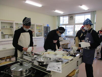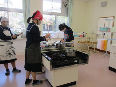 3月13日(金)、2年生家庭科の授業で調理実習を行いました。今回のメニューは、郷土料理をテーマにしてあり、「いきなり団子」、「いちご大福」、「高菜のおやき」でした。2年生は1学期に実施した「食育交流料理教室」以来の調理実習になりました。