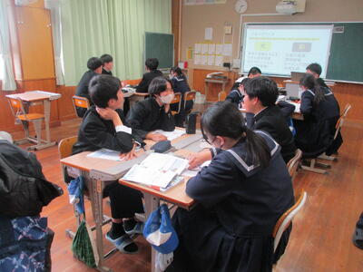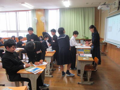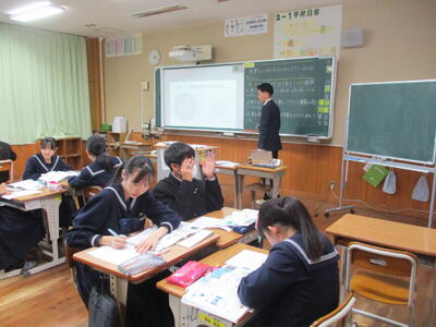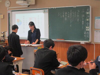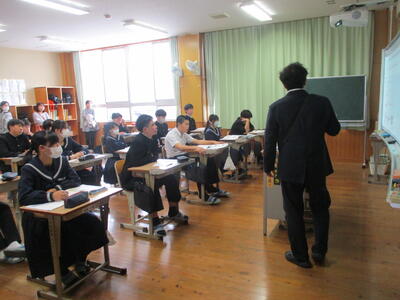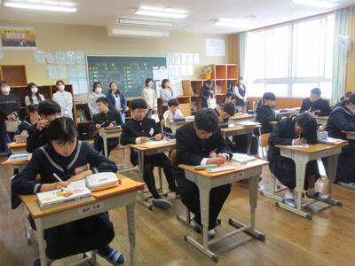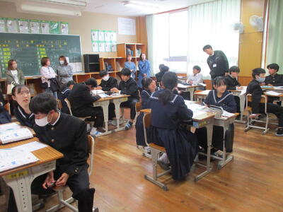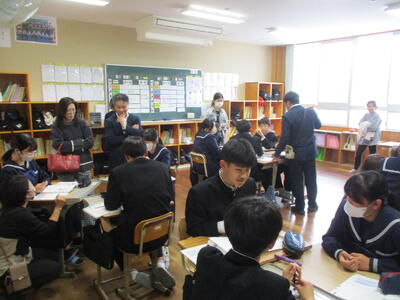 4月24日(金)に授業参観を行いました。1年生は国語で「一行詩」について学び、自分でオリジナルの一行詩を創っていました。2年生は理科で「原子」について学んでいました。3年生は保健体育で「スポーツにおける国際大会の光と影」についての学習でした。途中、保護者の方々も生徒たちと一緒に考える場面もあったようでした。1年生は入学して3週間近く経ちましたが、中学校生活にも少しずつ慣れ、楽しく授業に参加し学習しているようすをご覧いただけたと思います。