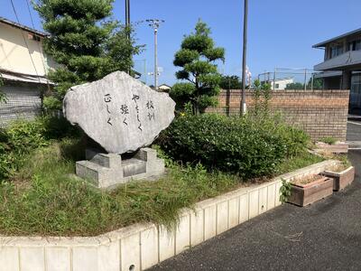 この石碑は昭和49年度本校卒業生によって寄贈されています。石碑の周りの土台には、卒業生の名前が彫り込まれています。
