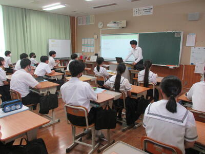 講師に、八代税務署から江頭様、水江様をお招きし、税の種類や租税の意義、役割を正しく理解し、その使い道に関心をもってもらうことを目的に開催しました。お話の途中には、体験コーナーとして、1億円の入ったジェラルミンケースを実際に生徒に持ってもらい、その重さを実感してもらう場面もありました。