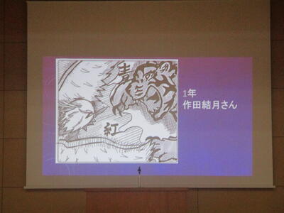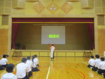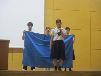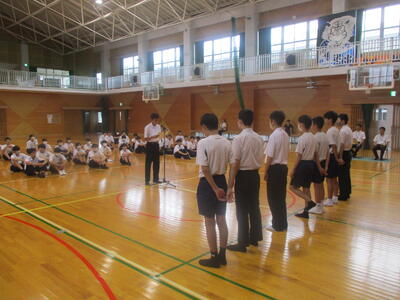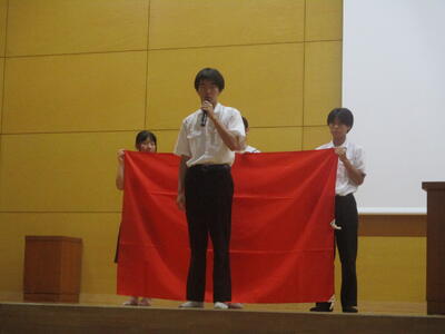 7月18日(金)終業式を終えた後、生徒会主催による体育大会結団式を行いました。始めに、体育大会実行委員長である小林澪雄さんが、今年の体育大会に向けての意気込みや気を付けてほしいことなど、全校生徒に向けて話しがありました。次に、紅団は松永響輝さん、青団は宇野 雄さんのMCによる、それぞれのBGMに合わせたマスコットリーダー・副団長・団長の紹介がありました。その後、校長先生より各団長へ団旗の授与と激励の言葉をいただきました。そして、団長による挨拶があり、今年の体育大会に向けて各団のテーマと団長としての思いを伝えてくれました。最後に、今年の体育大会のテーマソングの紹介とその音楽に合わせて、今年のプログラムの表紙を飾るイラスト(1年作田結月さん作)の紹介がありました。